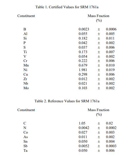 表 1 报告了 SRM 1761a 的 14 种成分的认证值。表 2 报告了七种成分的参考值。表 3 报告了 Fe 的信息值。对于所有元素,值都以质量分数报告 [1]。赋值类别基于 NIST 用于化学参考材料 [2] 的术语和模式的定义。